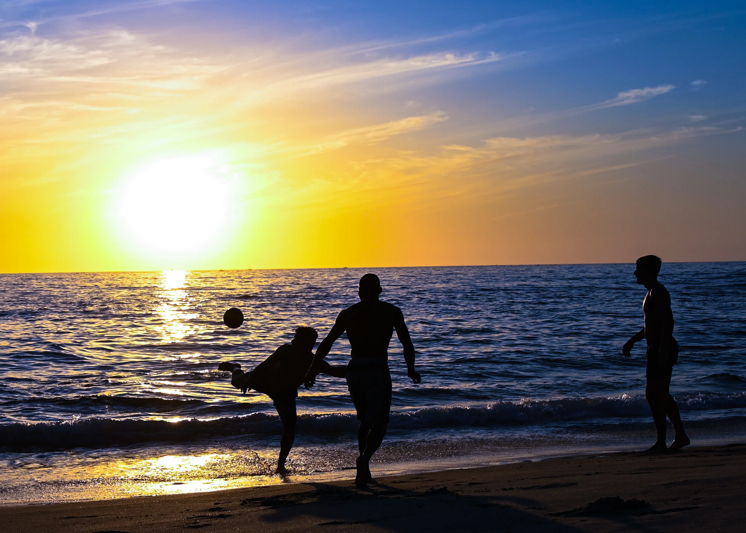 Men play soccer while the sun sets at Windansea Beach in San Diego, CA.